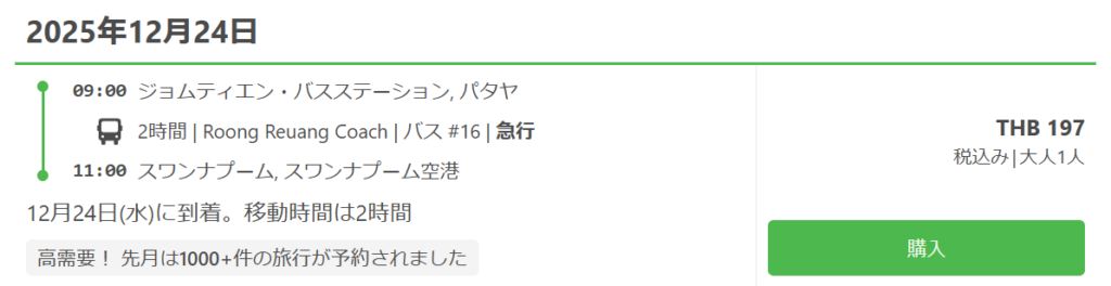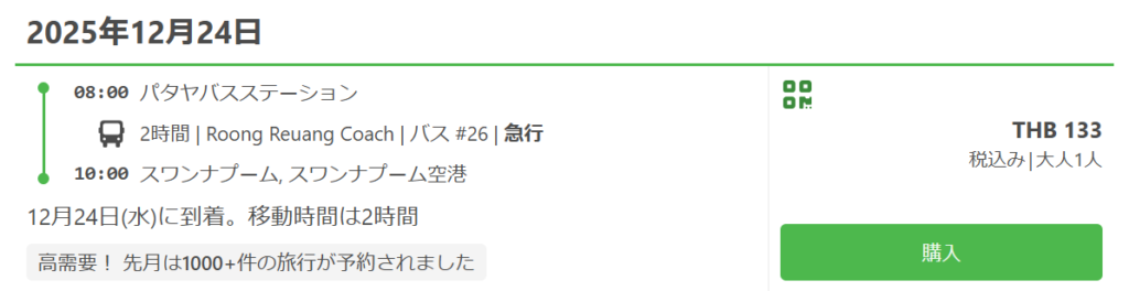 同:ノースパタヤバスターミナル発なら133THB、別途預入荷物20kg未満20THB。