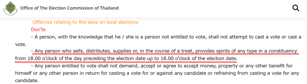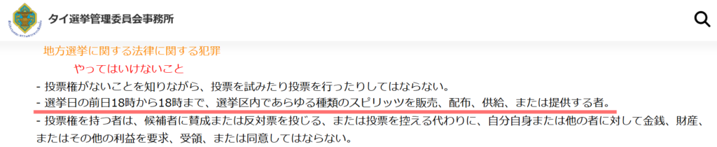 タイ選挙管理委員会による酒類販売取り扱いに関する注意事項が下記の画像だ。