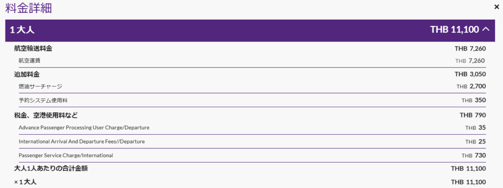 片道運賃は¥36,000程度だが、諸税として燃料サーチャージ以外にも「予約システム使用料(350THB)」「旅客情報システム使用料(35THB)」「手数料(25THB)」「旅客サービス施設使用料(730THB)」と諸々加算されている。