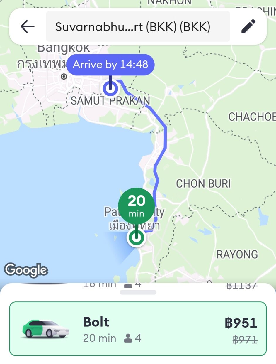 下の画像、これは昼間にパタヤ⇒スワンアプーム空港をBoltで検索してみた結果だ、恐らく高速代は別だ。